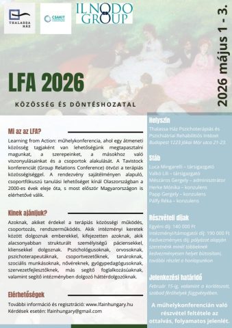 Az LFA alapvető célja azok kompetenciáinak fejlesztése, akik valamilyen segítő célú intézményben dolgoznak szakemberként vagy háttérdolgozóként. Fejlődési lehetőséget nyújt számos szakma képviselői számára, úgy mint nővérek, adminisztrátorok, szocioterapeuták, szociális munkások, gyógypedagógusok, pedagógusok, pszichológusok, pszichoterapeuták, pszichiáterek, neuropszichológusok, mentálhigiénés szakemberek, szervezetfejlesztők, pszichoterápiás osztályon dolgozók stb. Segítő szervezetben betöltött vezetői pozíció esetén is ajánljuk, valamint azoknak, akik érdeklődnek a csoportozás, rendszerműködés iránt." További információ a honlapon: http://www.lfainhungary.hu/